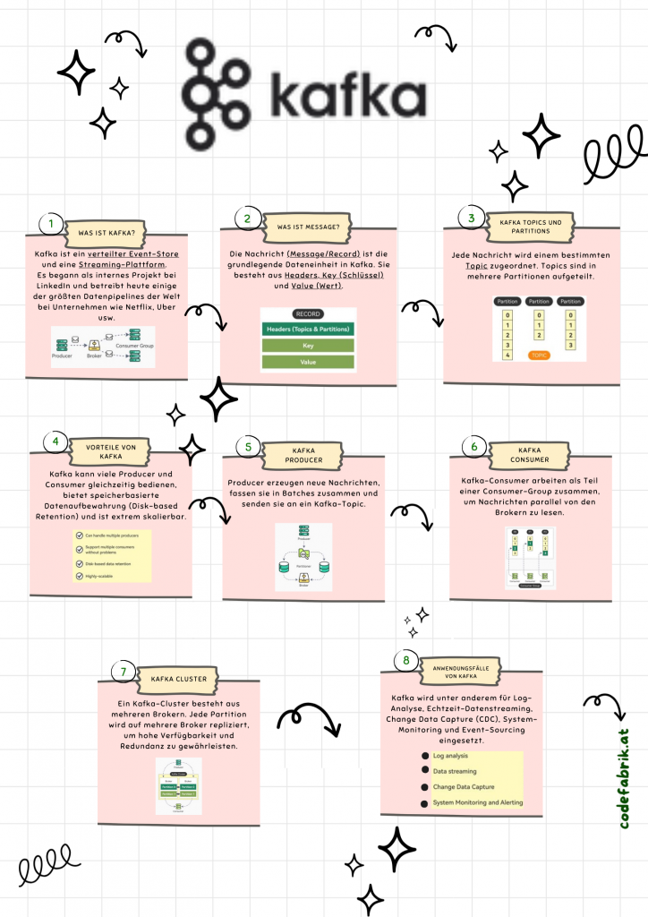 Kafka ist eine verteilte Platform für Event-Streaming. Es begann als interneres Projekt bei LinkedIn, wird sie heute von Firmen wie Netflix, Uber für riesige Datenströme genutzt.