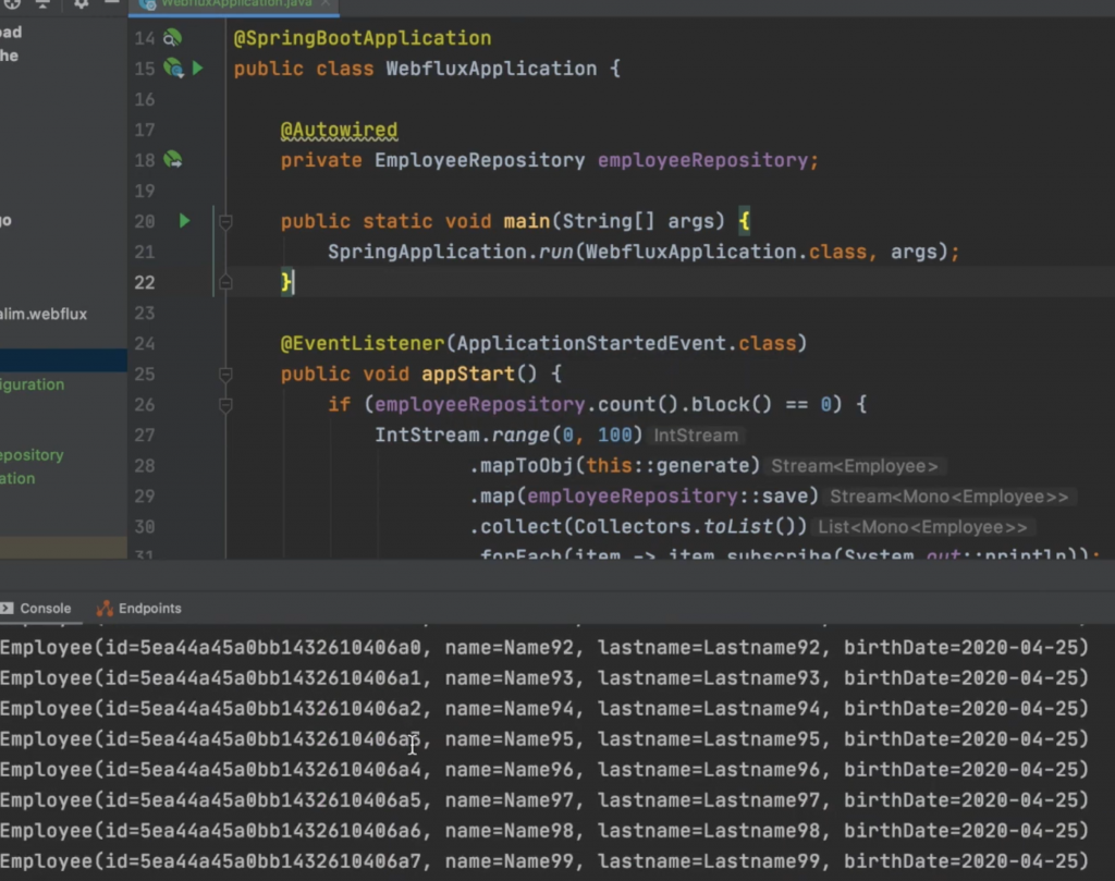 ✔ Diese Methode läuft automatisch beim Programmstart. ✔ Sie prüft, ob die Datenbank leer ist. ✔ Wenn ja, werden 100 Employees erzeugt und gespeichert. ✔ Jeder Eintrag wird danach über subscribe() ausgegeben.