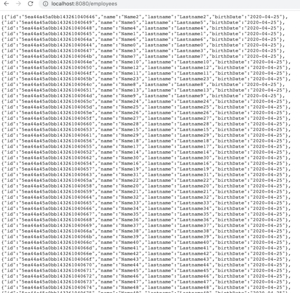 Im folgenden Beispiel werden 100 Employee-Datensätze (von 0 bis 99) beim Programmstart generiert und in die Datenbank gespeichert.